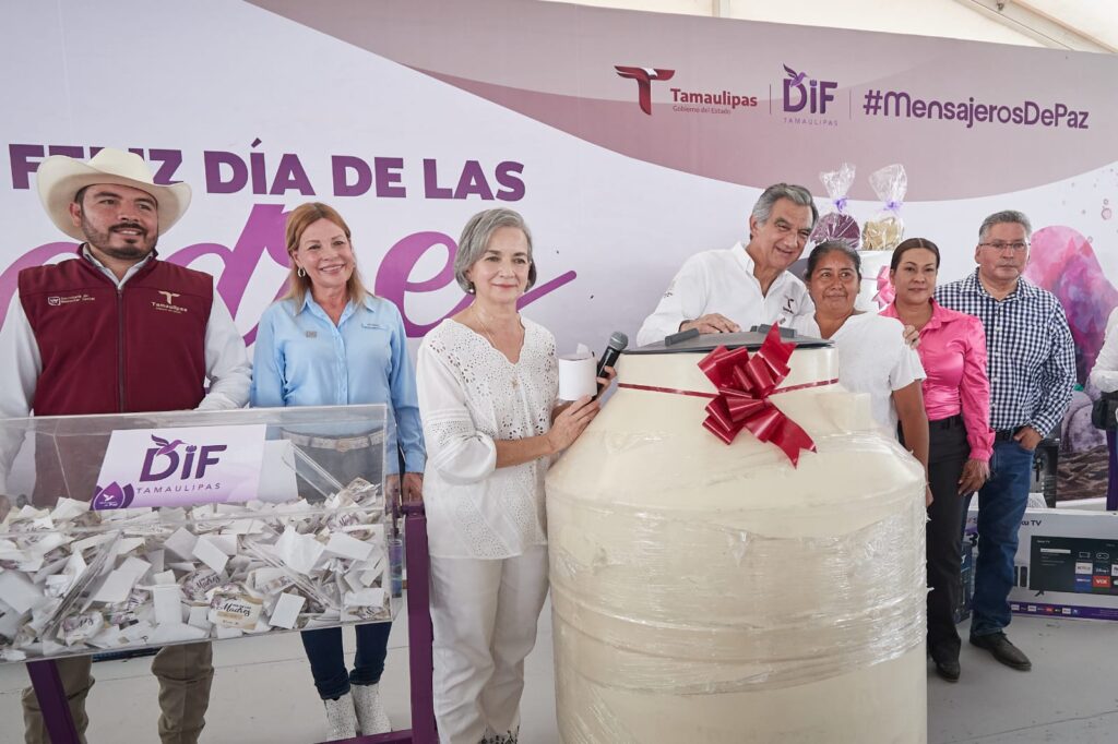 El personal del DIF Tamaulipas se multiplica; todos trabajan, todos van y vienen entre las mesas; llevan agua, entregan despensas, acercan los tinacos para las mamás que se los han ganado, todo es celebración.
