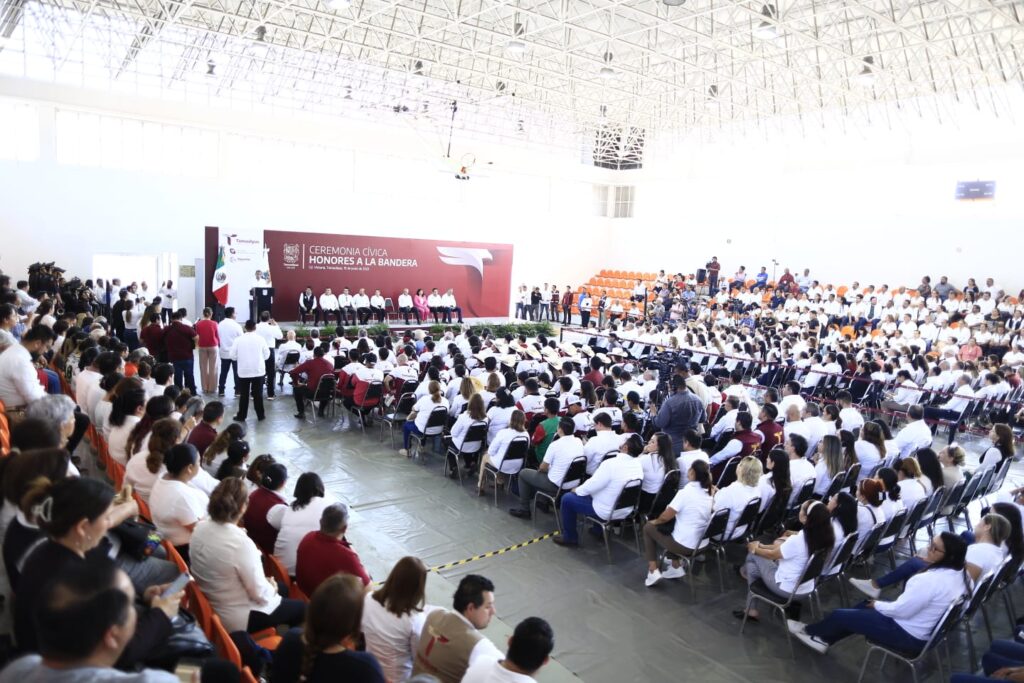 “Debemos y podemos llenar las actividades de cada cancha, de cada complejo, de cada Unidad Deportiva, por eso es un gusto venir a este recinto para celebrar la ceremonia cívica de honores a la bandera y ratificar frente a todas y todos ustedes el compromiso de impulsar una política de deporte en Tamaulipas destinada a romper récords históricos”, afirmó.