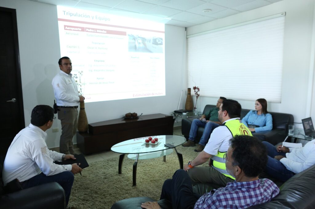 El secretario de Desarrollo Rural, Dámaso Anaya Alvarado, el coordinador estatal de Protección Civil, Luis Gerardo González de la Fuente, así como los representantes de la empresa encargada del programa de estimulación de lluvias, Adalberto Mústieles y Alejandro Vázquez, los capitanes Oscar H. Ramírez y Carlos González, de la Dirección de Servicios Aéreos y funcionarios de la Secretaría de Recursos Hidráulicos, se reunieron en el hangar del Gobierno del Estado, en el aeropuerto Pedro J. Méndez y tomaron la decisión de realizar el vuelo en un polígono de nueve municipios de la región cañera y del centro de la entidad.