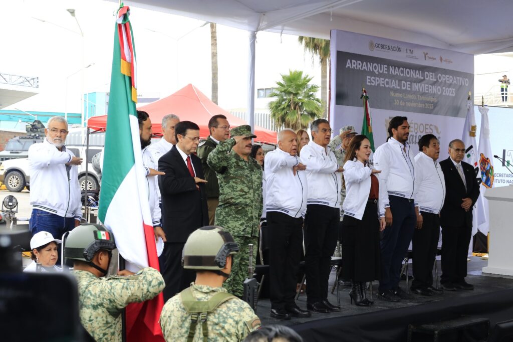 Nuevo Laredo, Tamaulipas.- El gobernador Américo Villarreal Anaya y el comisionado del Instituto Nacional de Migración, Francisco Garduño Yáñez, dieron el banderazo de inicio al Operativo Especial de Invierno 2023 del Programa Héroes Paisanos, evento en el cual el mandatario estatal aseguró que el Gobierno de Tamaulipas está listo para brindar atención, servicio y garantizar el respeto a los derechos de los connacionales que arriban a México y transitan por el estado, en este periodo de fin de año.