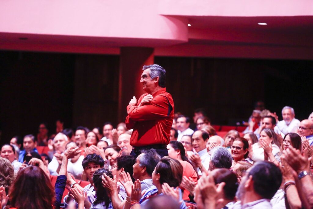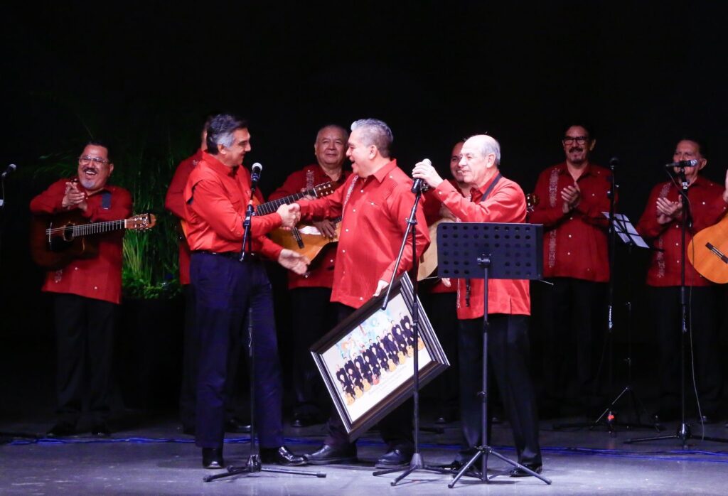 “Lo importante es volver a convivir, juntarnos, vernos y poder rememorar esos momentos (…) en los que podemos exaltar los valores realmente del ser humano”, dijo en su mensaje tras ser invitado a subir al escenario a recibir un reconocimiento por su apoyo a la rondalla.