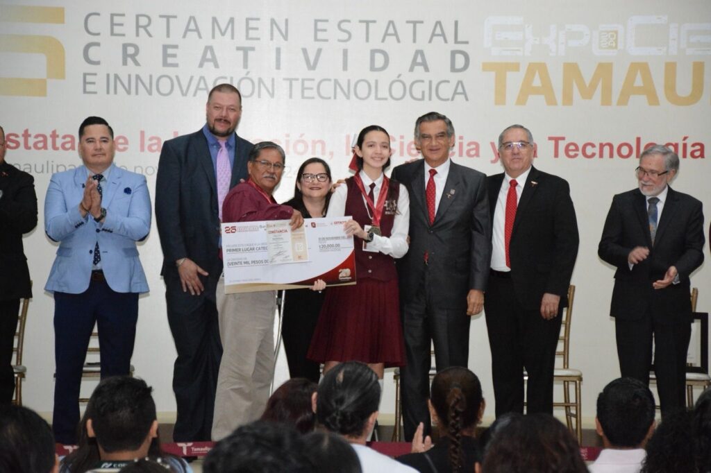 En la ceremonia se premió a los tres primeros lugares del certamen estatal de Creatividad e Innovación Tecnológica-ExpoCiencias Tamaulipas en las categorías Petit, Kids, Juvenil, Media Superior y Superior, quienes obtienen su acreditación a la ExpoCiencias Nacional 2024 que se llevará a cabo en Villahermosa Tabasco, del 3 al 6 de diciembre del presente año.
