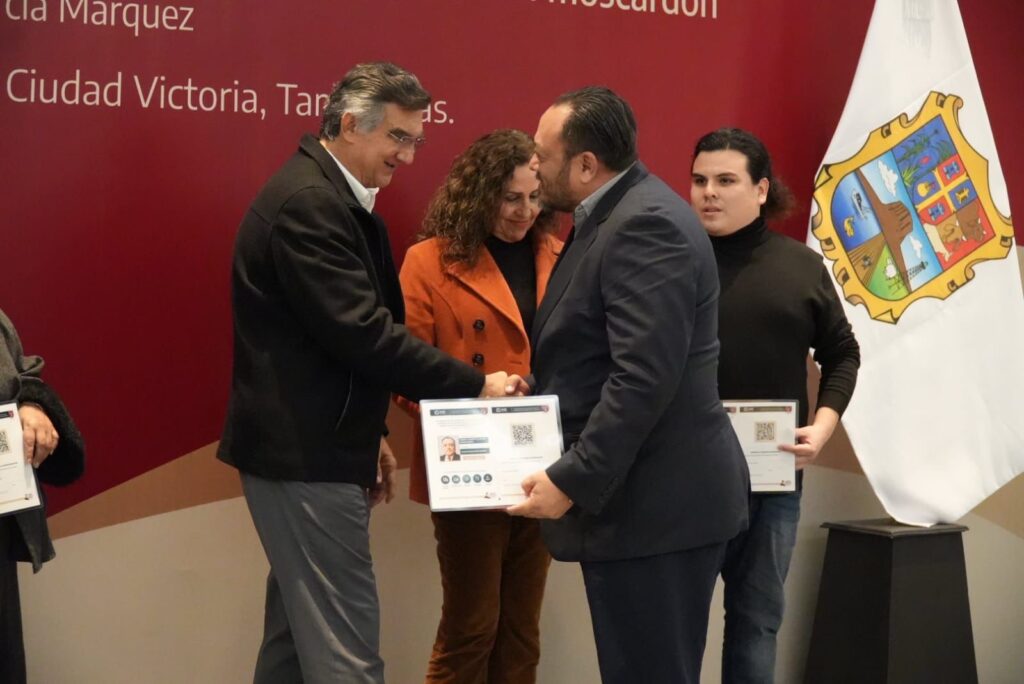 Durante la ceremonia, el gobernador entregó de manera simbólica a seis periodistas las tarjetas de afiliación al IMSS-Bienestar, de un total de 169 expedientes que están en proceso para otorgarles seguridad social.