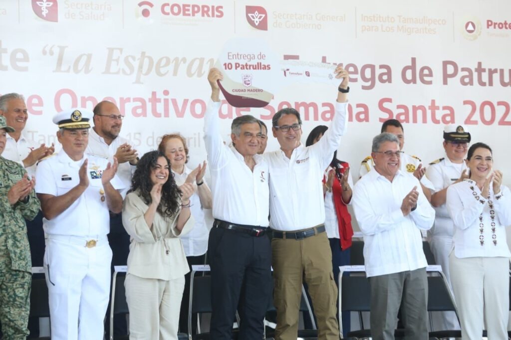 Como parte de la ceremonia, los presidentes municipales de Altamira, Armando Martínez Manríquez, de ciudad Madero, Erasmo González Robledo y la alcaldesa de Tampico, Mónica Villarreal Anaya, entregaron 10 patrullas cada uno para reforzar el equipamiento de la Guardia Estatal.