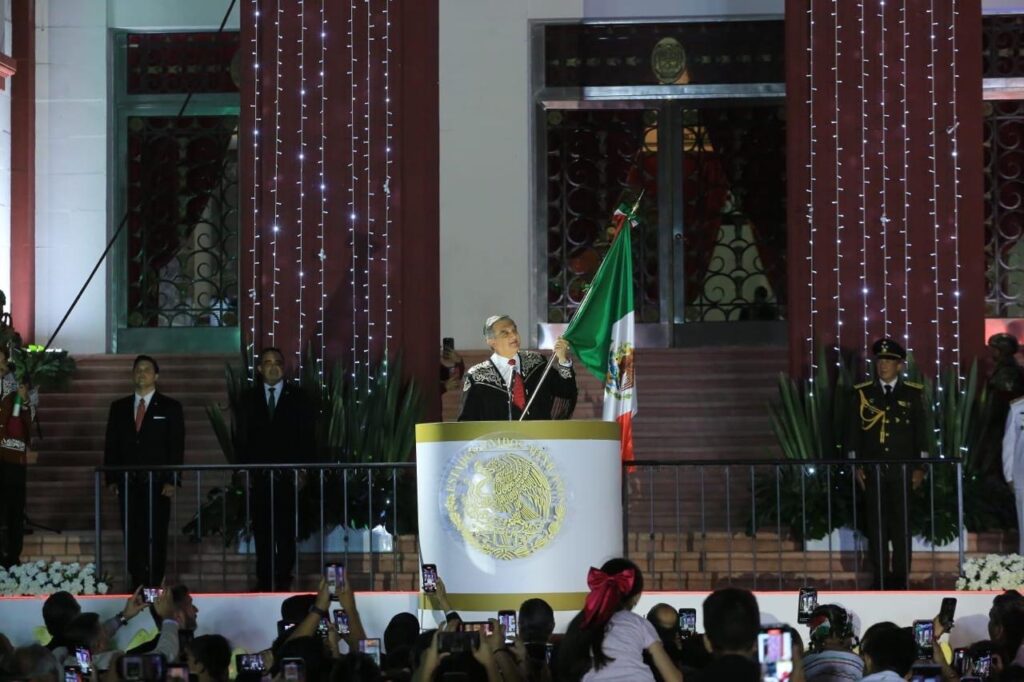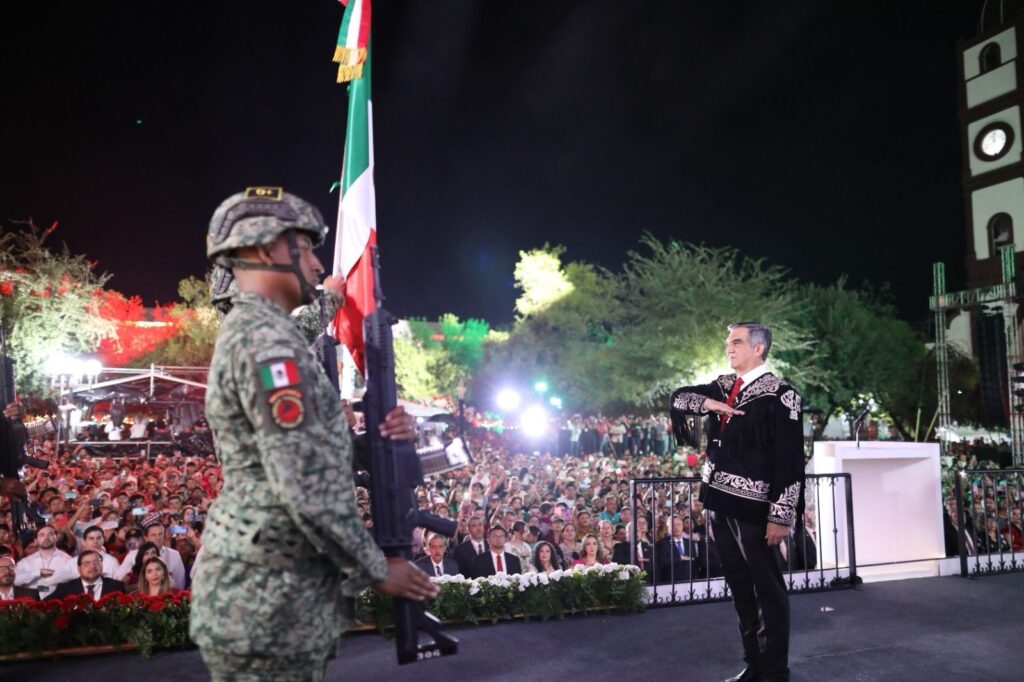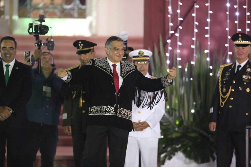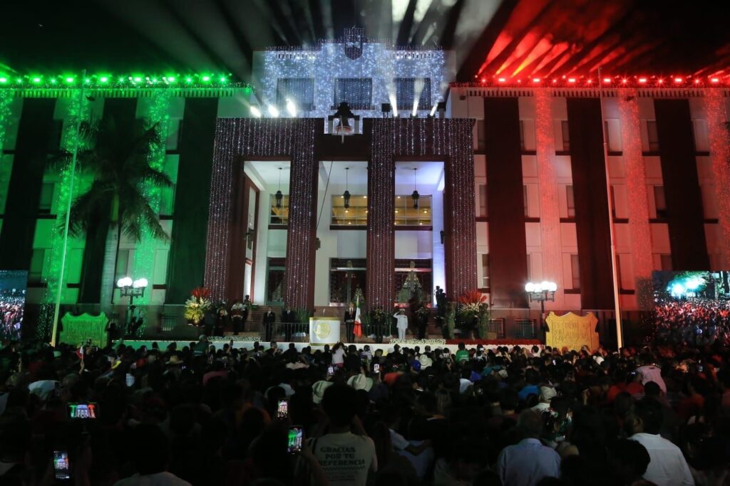 Ciudad Victoria, Tamaulipas. – Miles de familias tamaulipecas se congregaron en la Plaza Juárez de esta capital para conmemorar el 215 aniversario del Grito de Independencia, acto encabezado por el gobernador Américo Villarreal Anaya, quien en su arenga vitoreó a nuestros hermanos y hermanas migrantes, a la honestidad y la justicia, y a los independentistas tamaulipecos.
