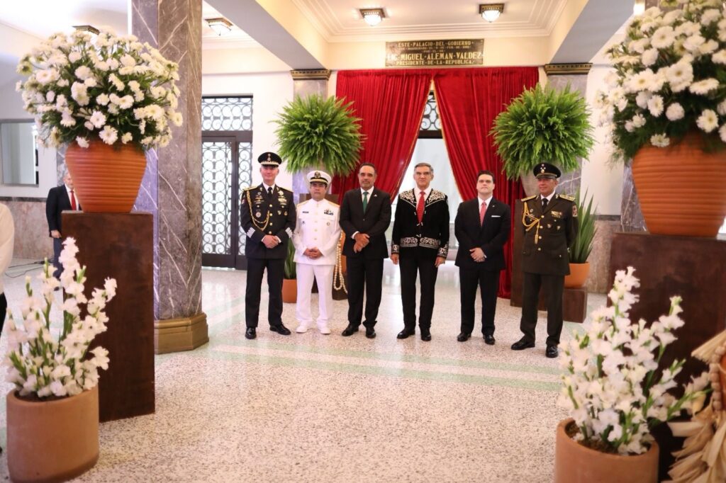 Desde la escalinata principal de Palacio de Gobierno, el gobernador de Tamaulipas recibió la bandera nacional de manos de la escolta del 77 Batallón de Infantería y exclamó.