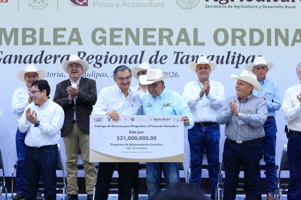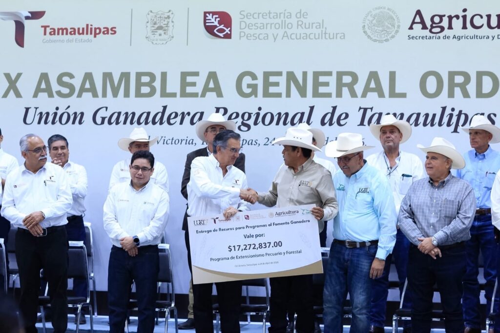 Ciudad Victoria, Tamaulipas.- El gobernador Américo Villarreal Anaya refrendó todo su respaldo al sector ganadero, a fin de seguir impulsando esta vocación y tradición que da identidad a Tamaulipas, y entregó más de 80.7 millones de pesos como apoyo para diversos programas de sanidad animal, mejoramiento genético y extensionismo pecuario.